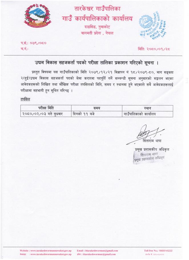 उद्यम विकास सहजकर्ता पदको परिक्षा कार्यक्रम सम्बन्धी सूचना