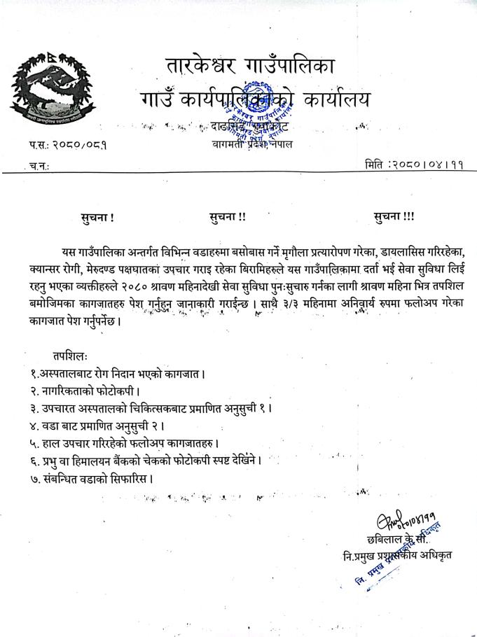 बाबु आमा विहिन बालबालिका संरक्षण कार्यक्रम अन्तर्गत दर्ता र नविकरण सम्बन्धी सुचना